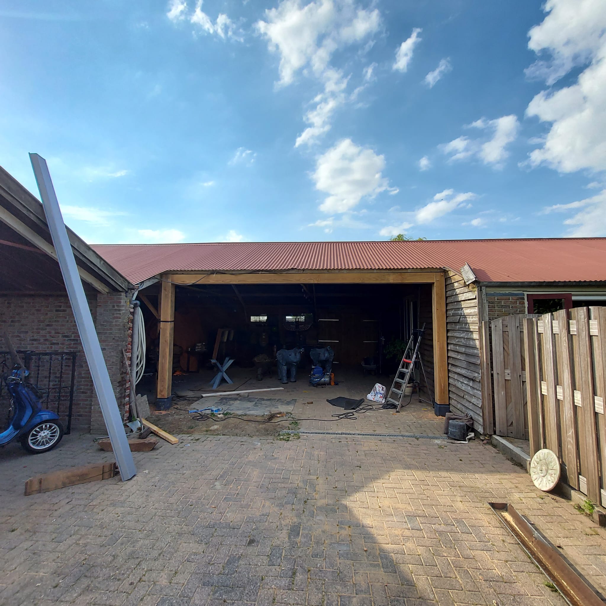 The first barn is almost finished. This construction is the part where we've started with, the first beams we sawed, chiseled and drilled holes info for the project.