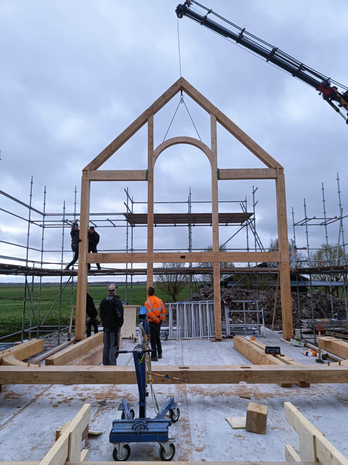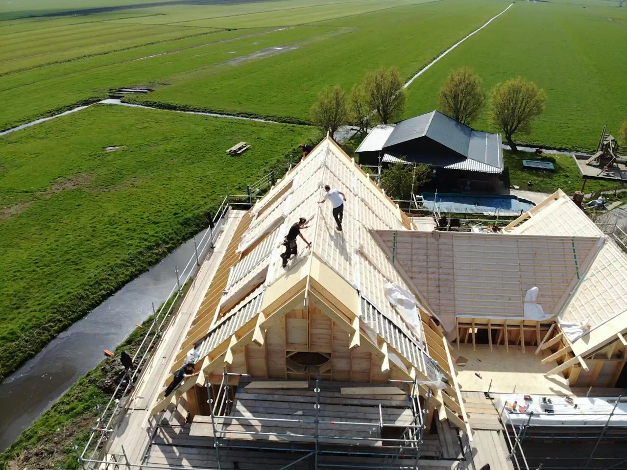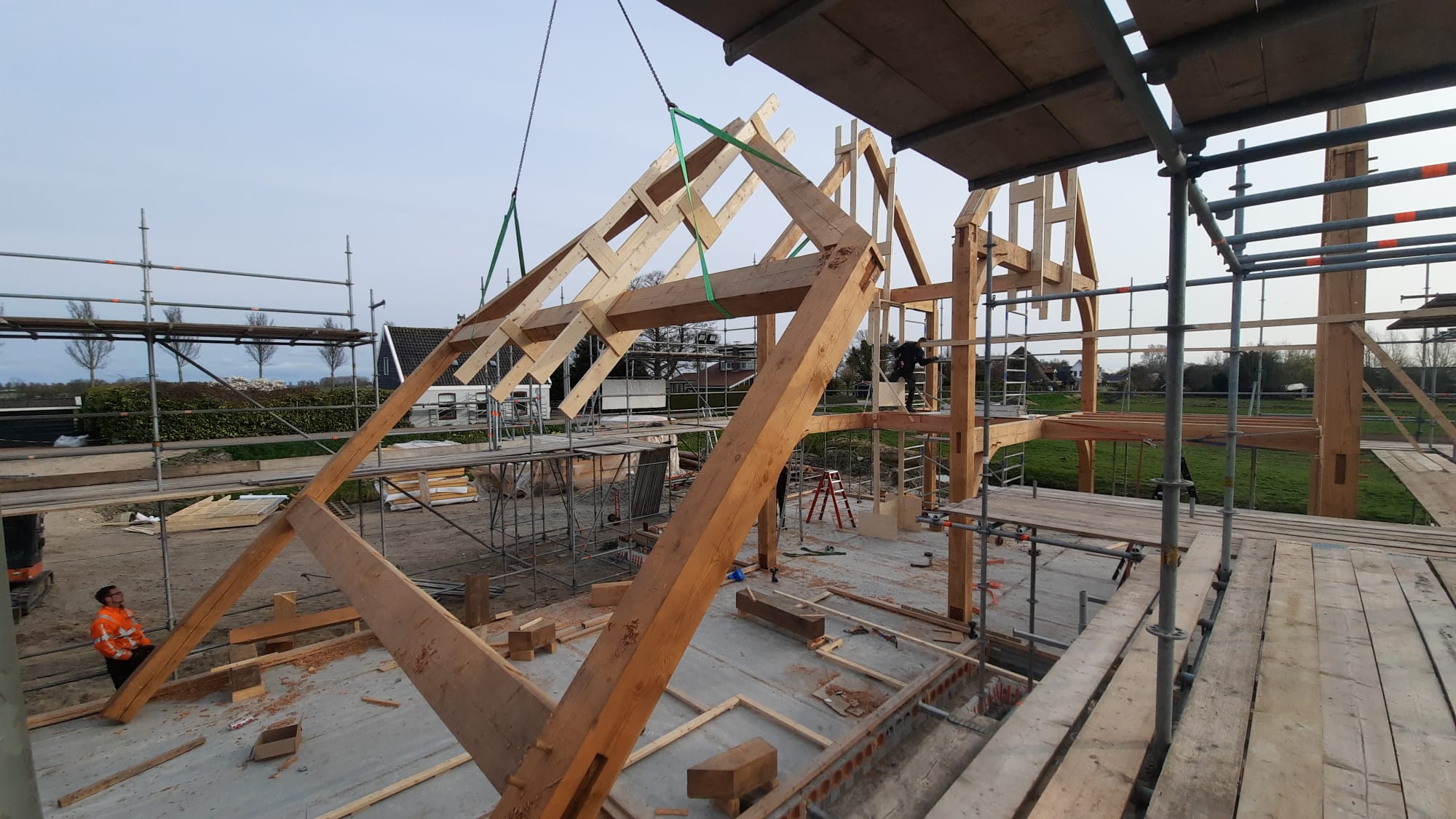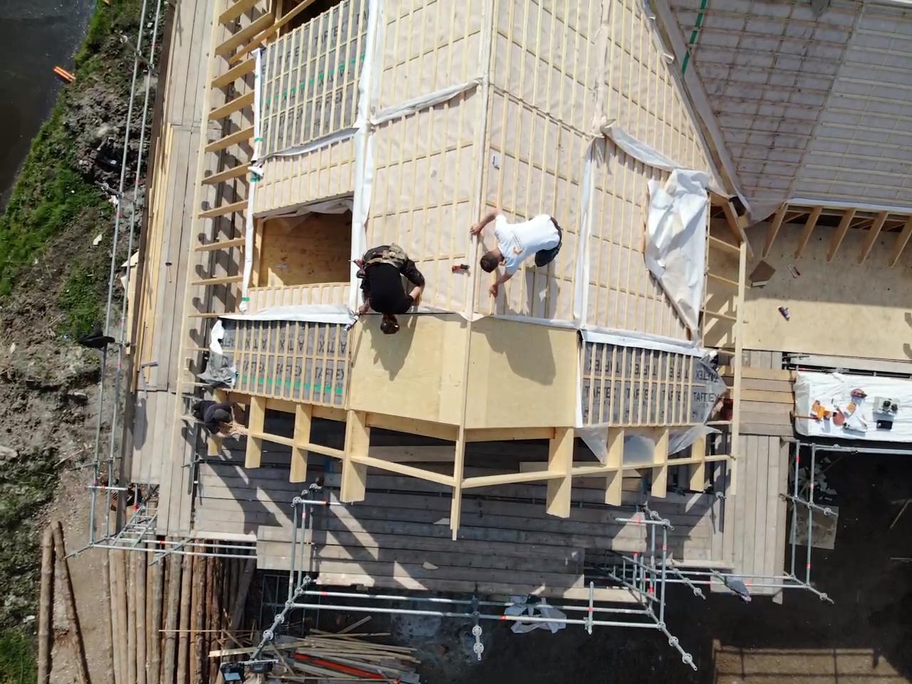 The first barn is almost finished. This construction is the part where we've started with, the first beams we sawed, chiseled and drilled holes info for the project.
