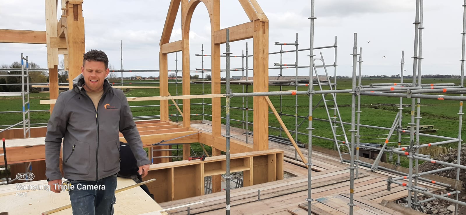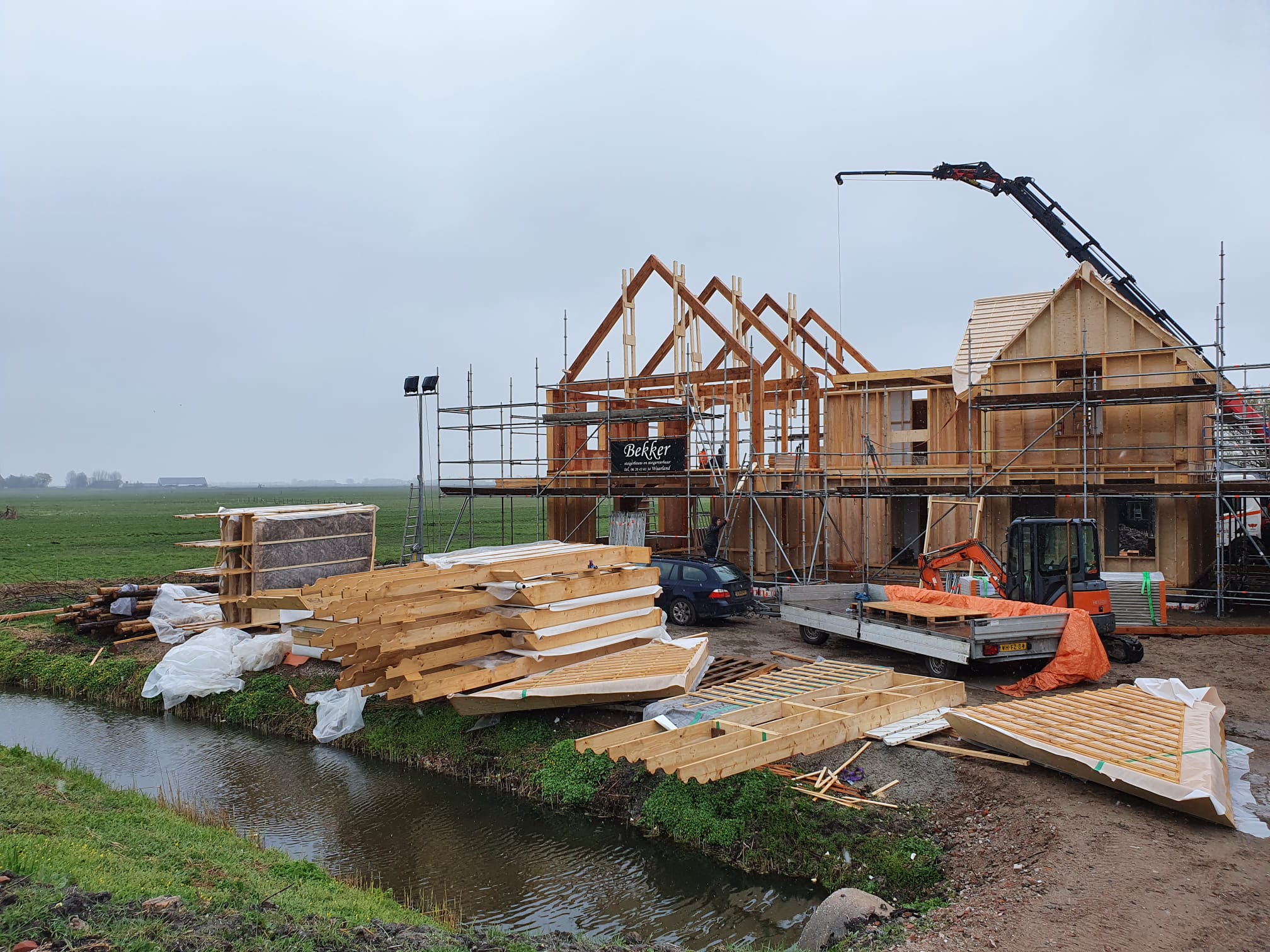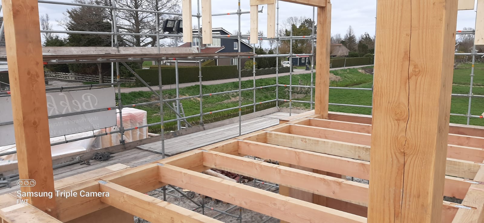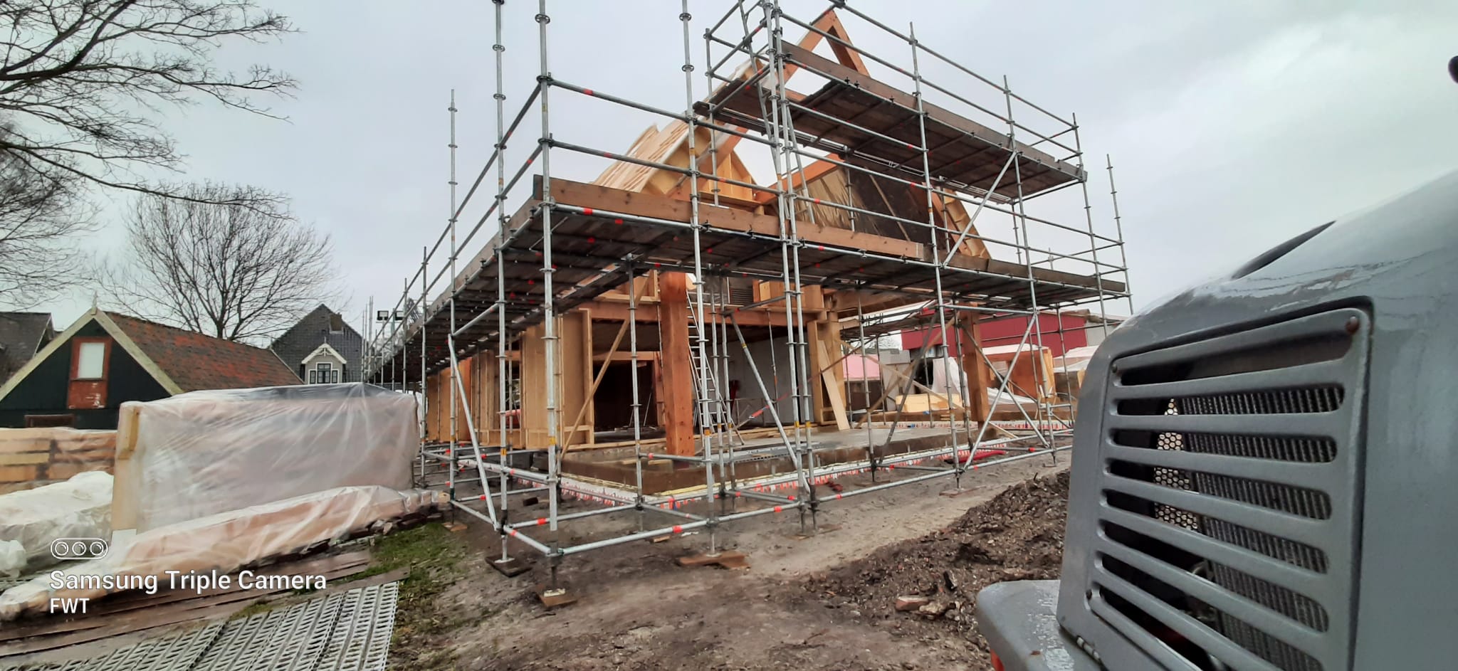 The first barn is almost finished. This construction is the part where we've started with, the first beams we sawed, chiseled and drilled holes info for the project.
